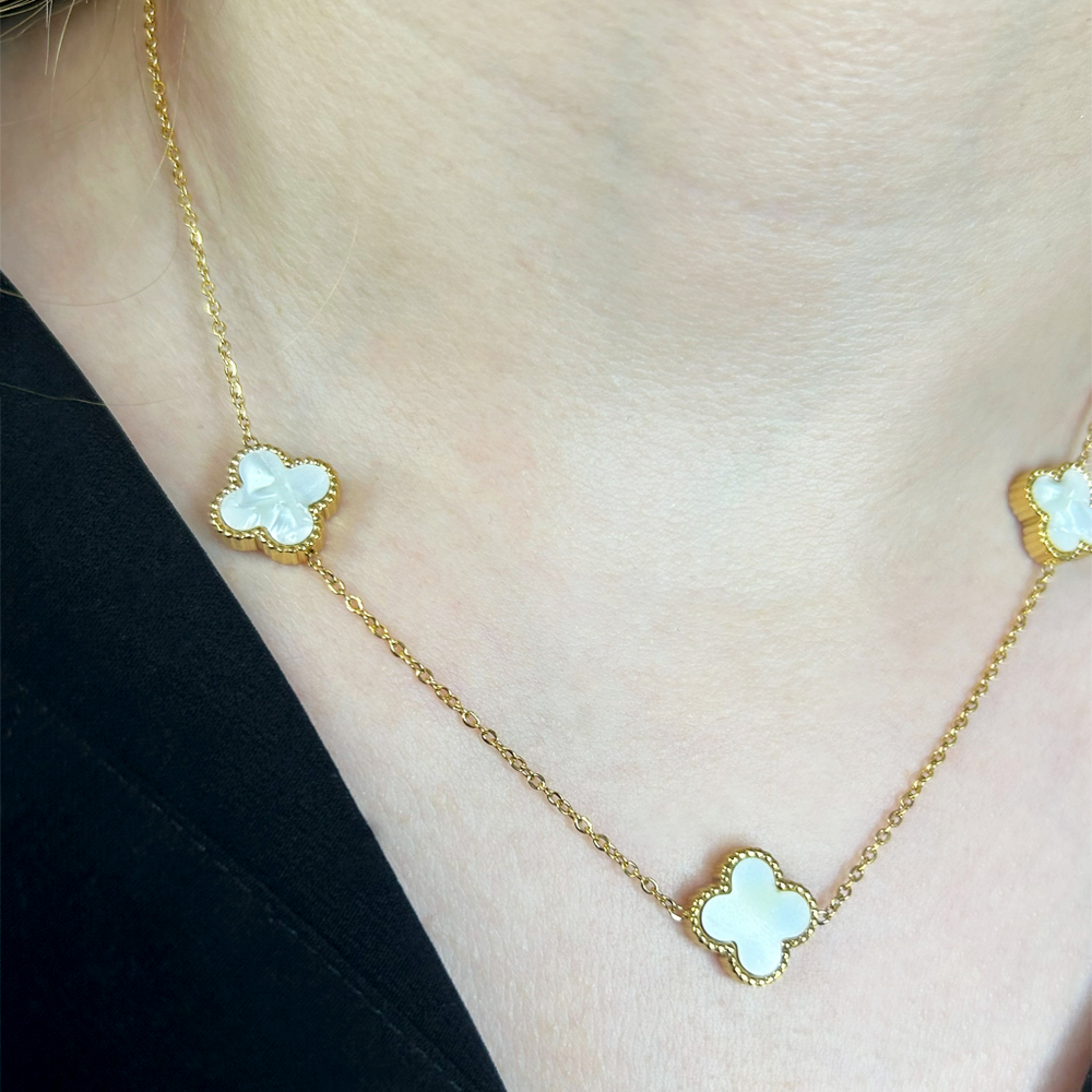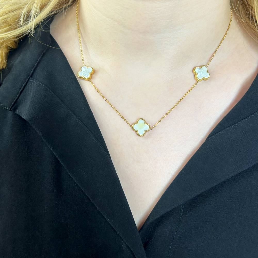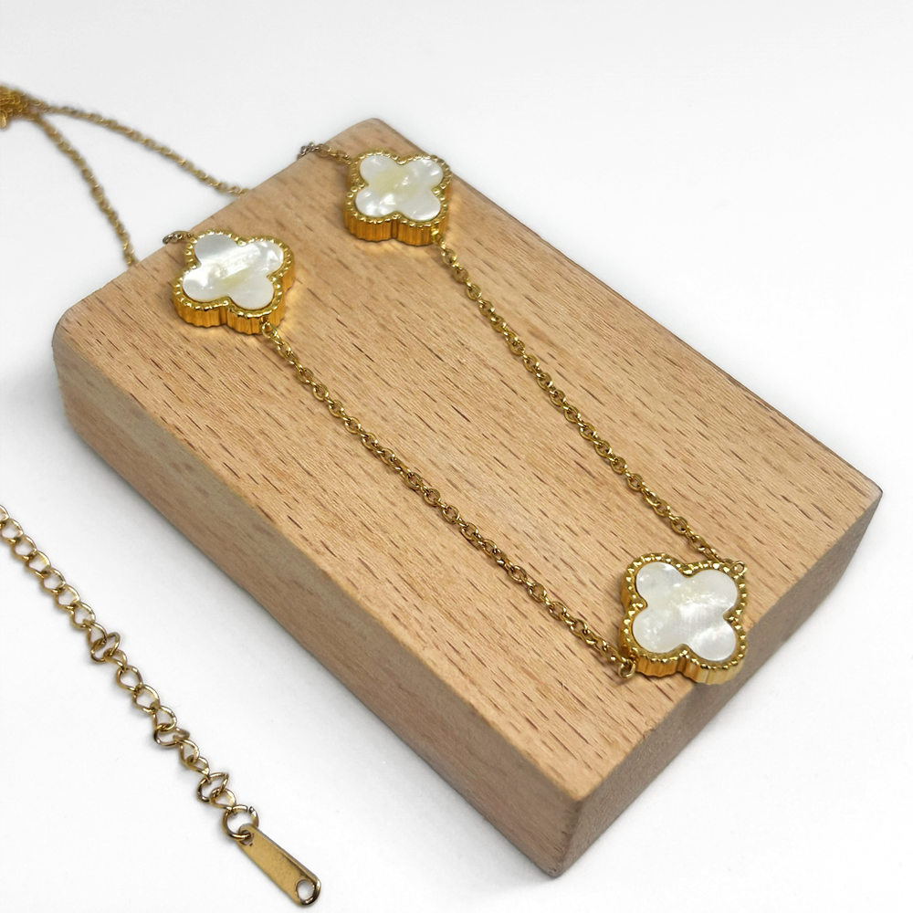 Üç adet beyaz yonca motifinin zarif bir şekilde yan yana dizildiği bu kolye, boyunda modern ve ışıltılı bir duruş oluşturur. Minimal tasarımının sunduğu sadelik, yonca sembolünün şans ve pozitiflik hissiyle birleşerek hem günlük stilinize hem özel anlarınıza uyum sağlar.