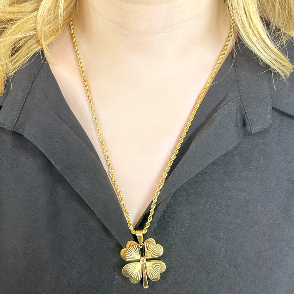 Burgu zincirin üzerindeki yonca motifleriyle şans ve şıklığı bir araya getiren uzun ve zarif bir tasarım.