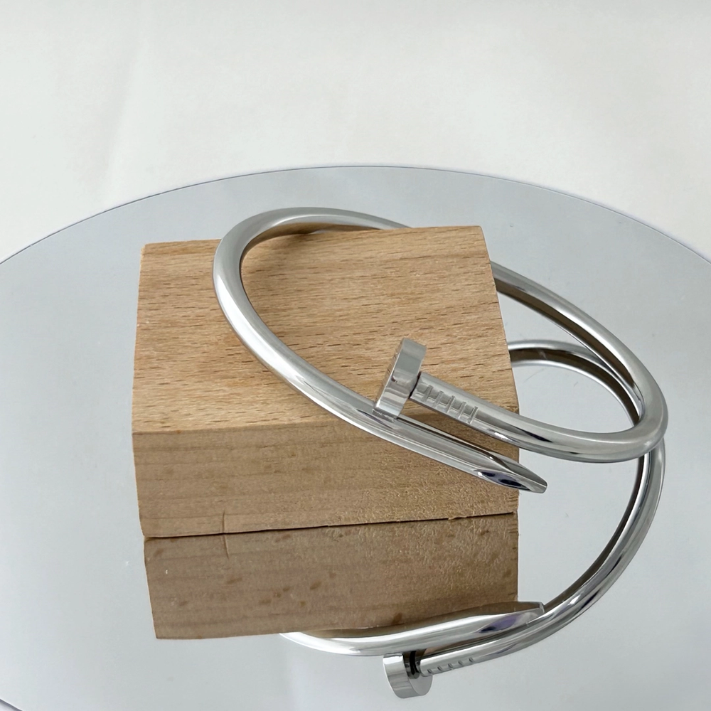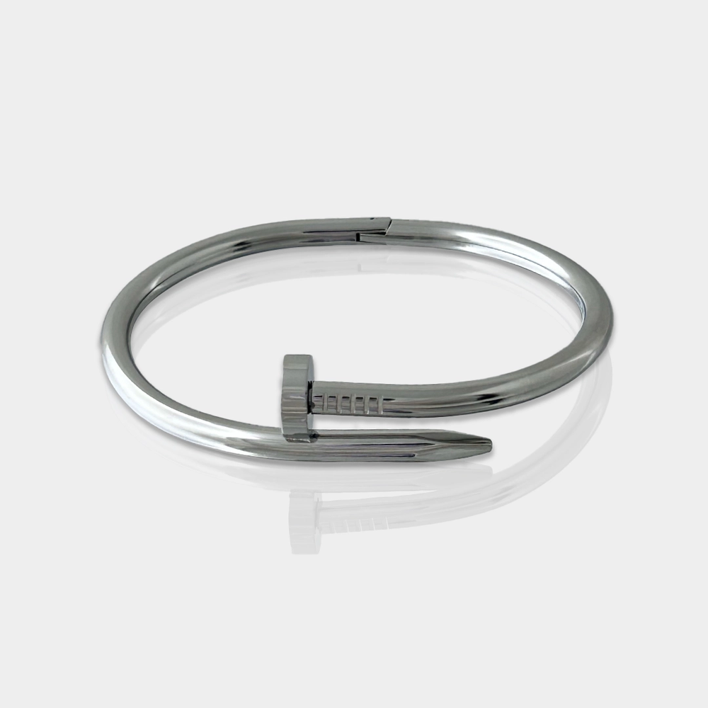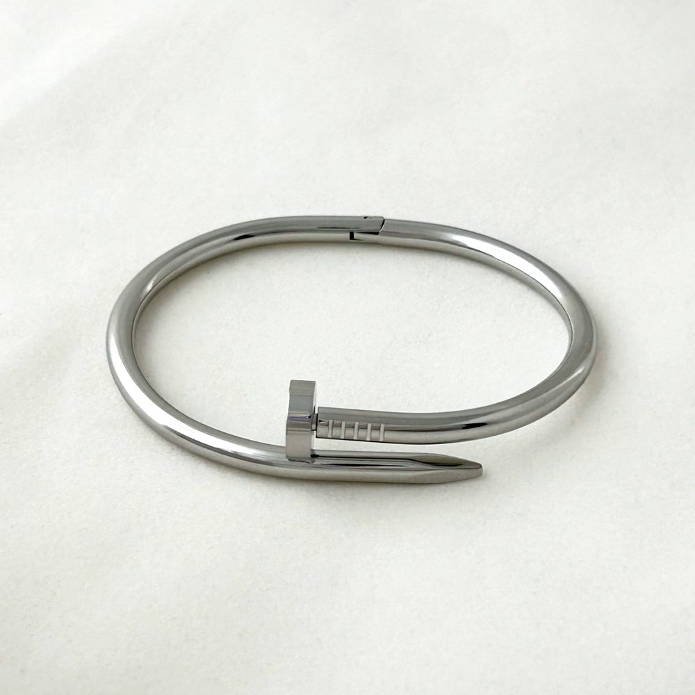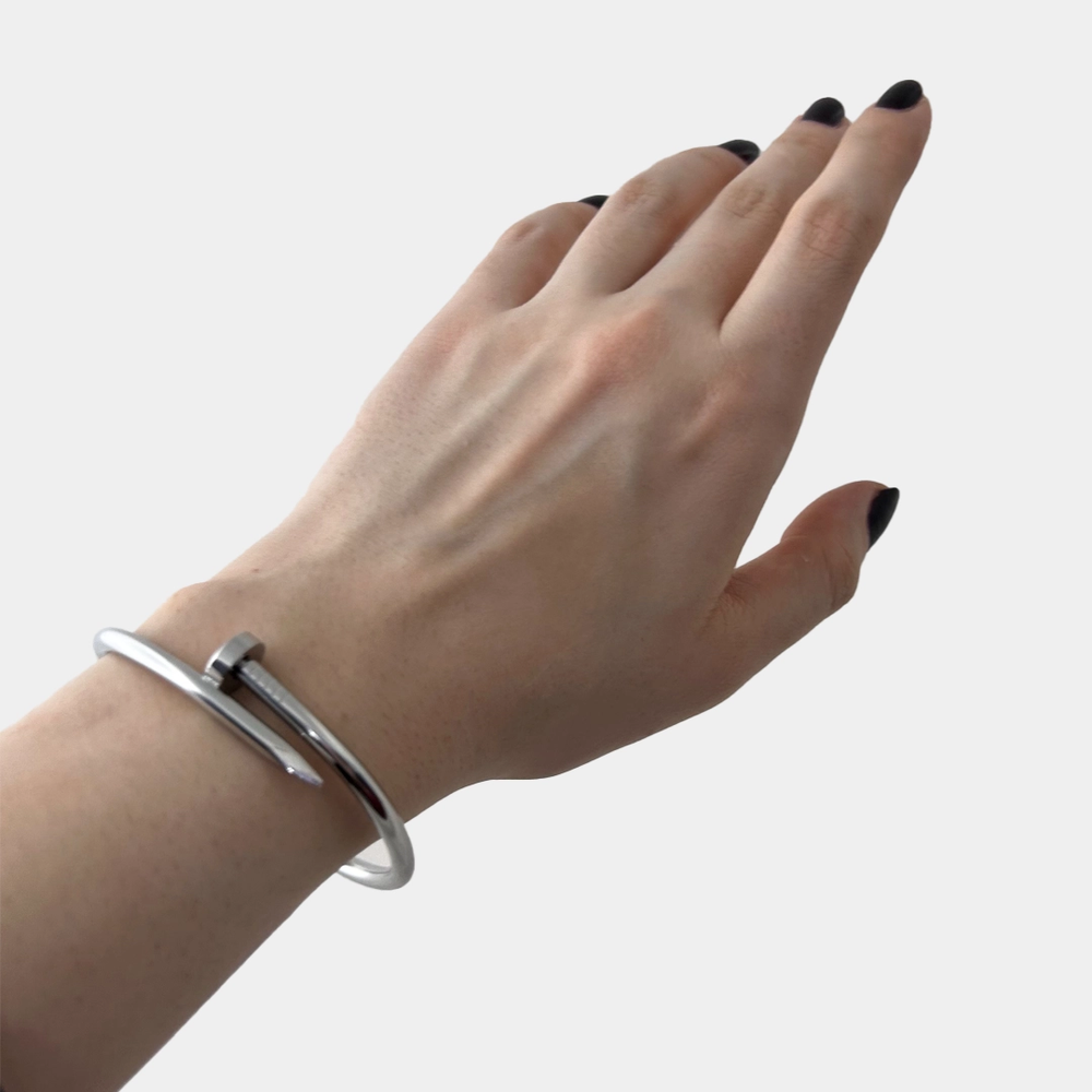 316L paslanmaz çelikten üretilen, gümüş kaplamalı yüzeye sahip Çivi Kelepçe Gümüş Bileklik; kararmaz, suya dayanıklıdır ve günlük kullanıma uygundur.