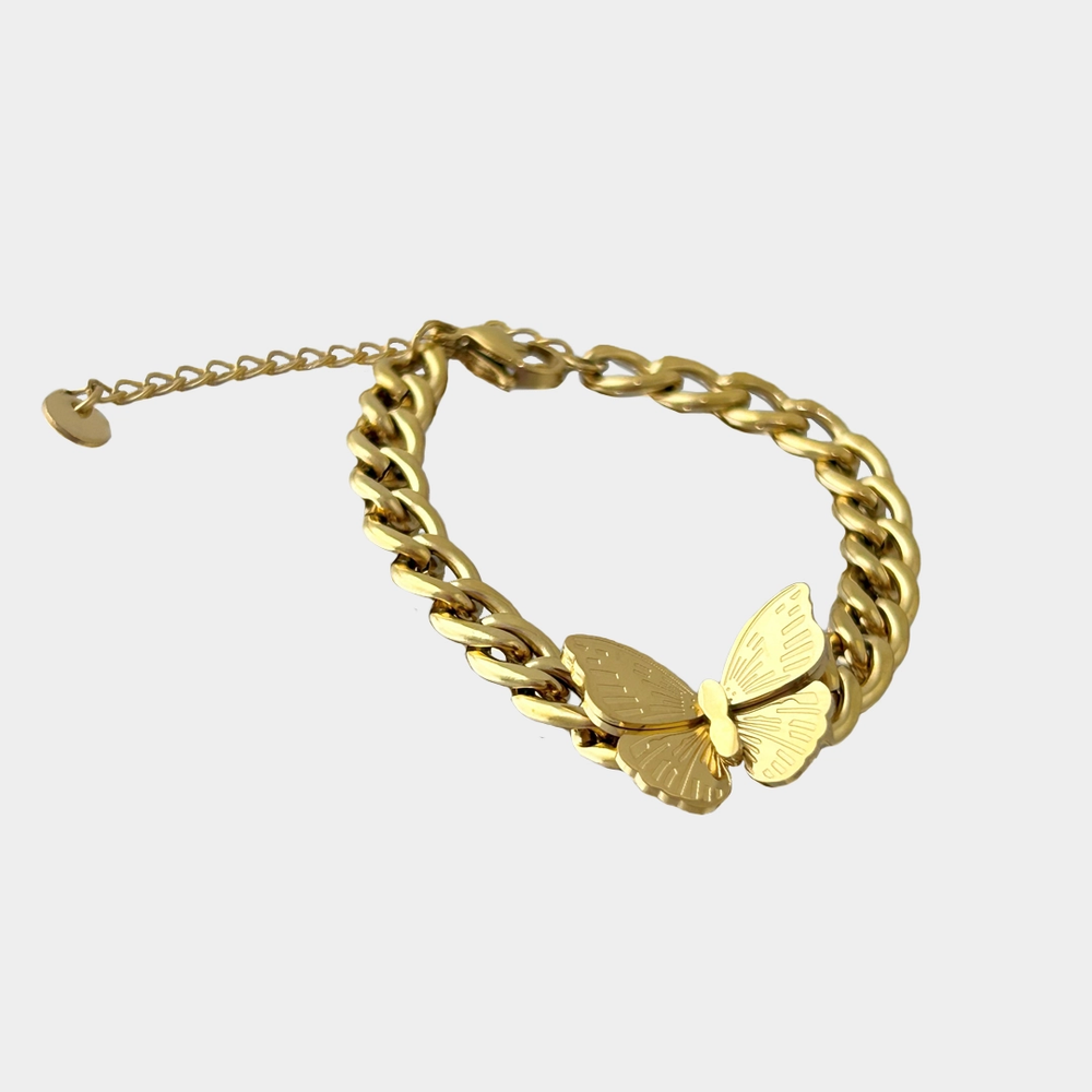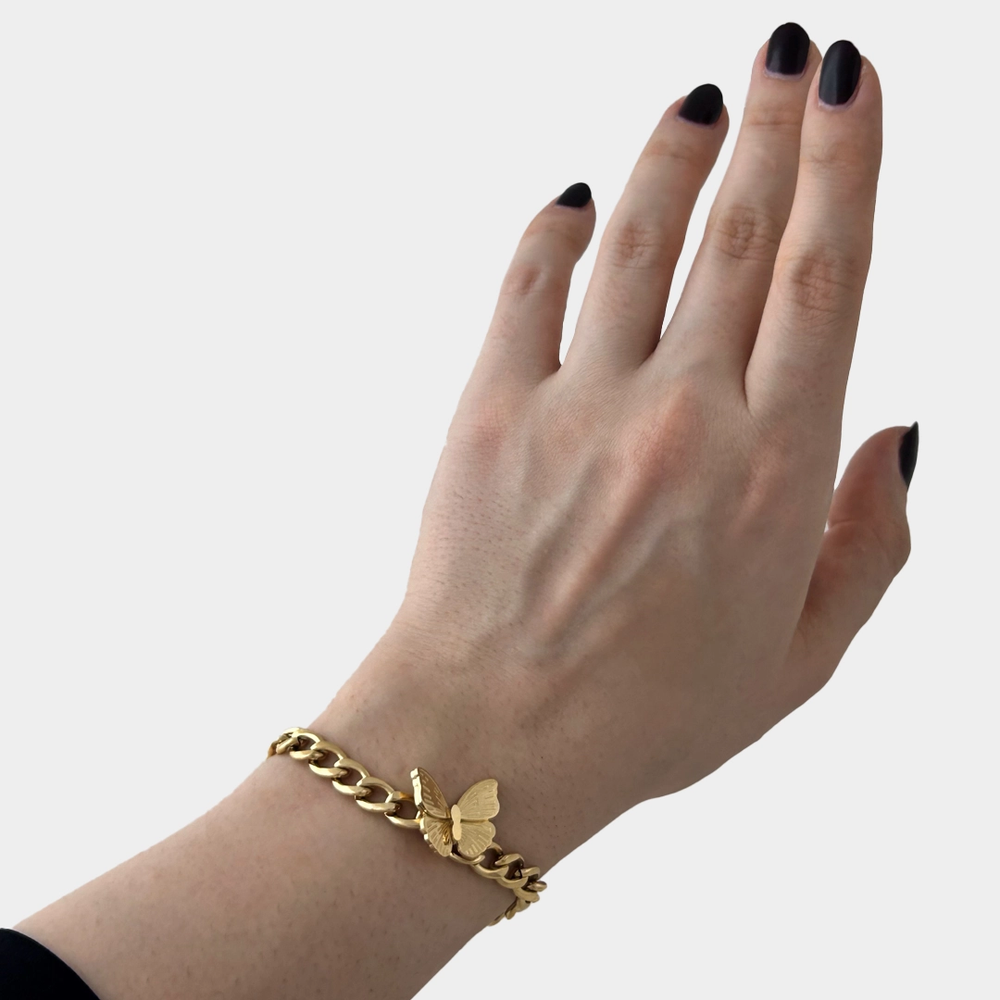 Zarif kelebek detayını modern zincir tasarımıyla buluşturan bu bileklik, günlük stilinize feminen ve hafif bir dokunuş katar. Hem sade hem şık görünümlerle kolayca uyum sağlayan zamansız bir modeldir.