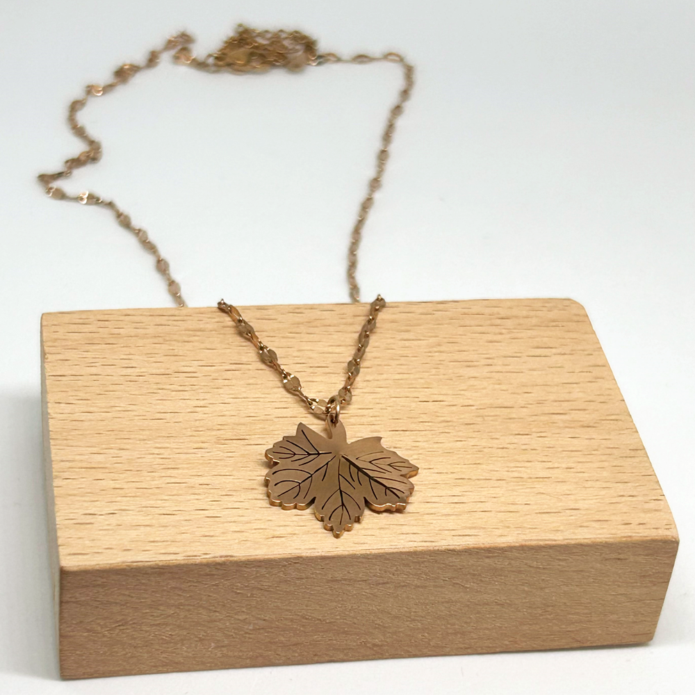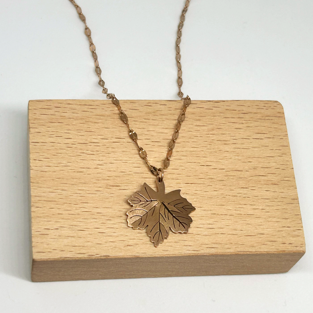 316L paslanmaz çelikten üretilen, rose gold kaplamalı yüzeye sahip Çınar Yaprağı Rose Gold Kolye; kararmaz, suya dayanıklıdır ve günlük kullanıma uygundur.