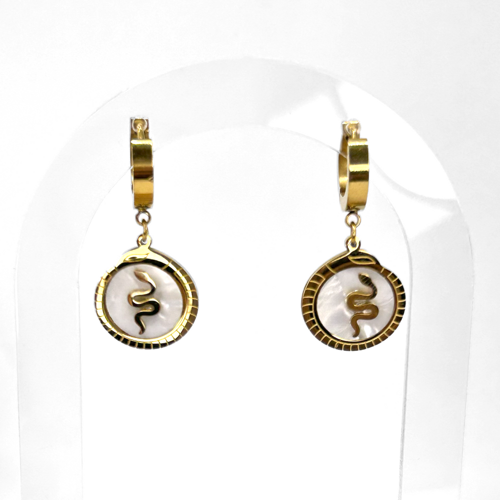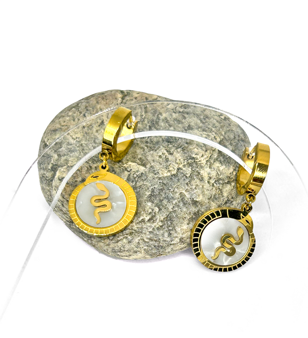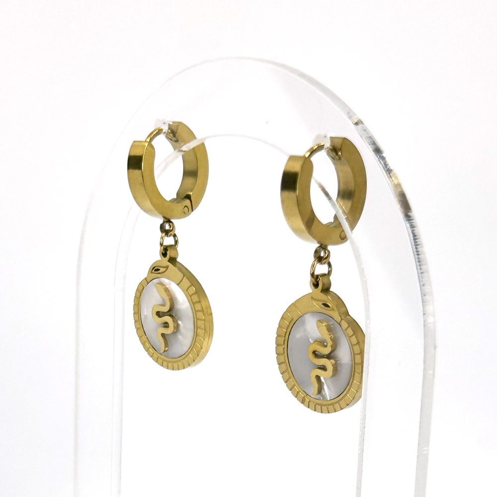 316L paslanmaz çelikten üretilen Yılan Sedef Altın Küpe; kararmaz, suya dayanıklıdır ve uzun süre parlaklığını korur.