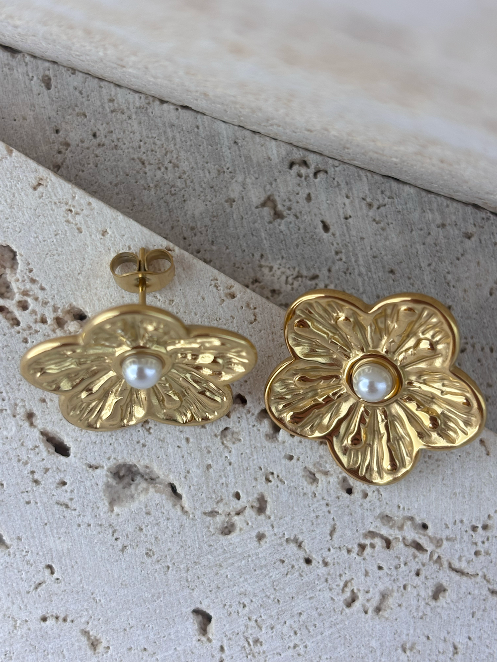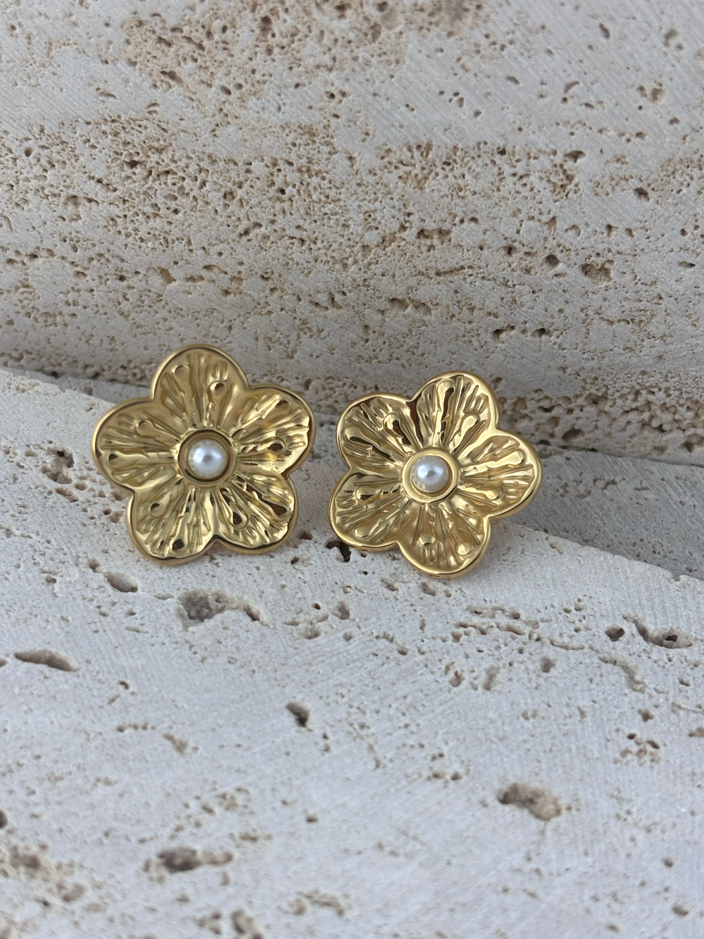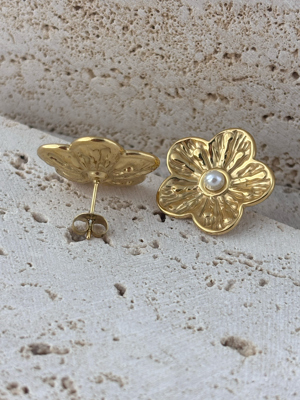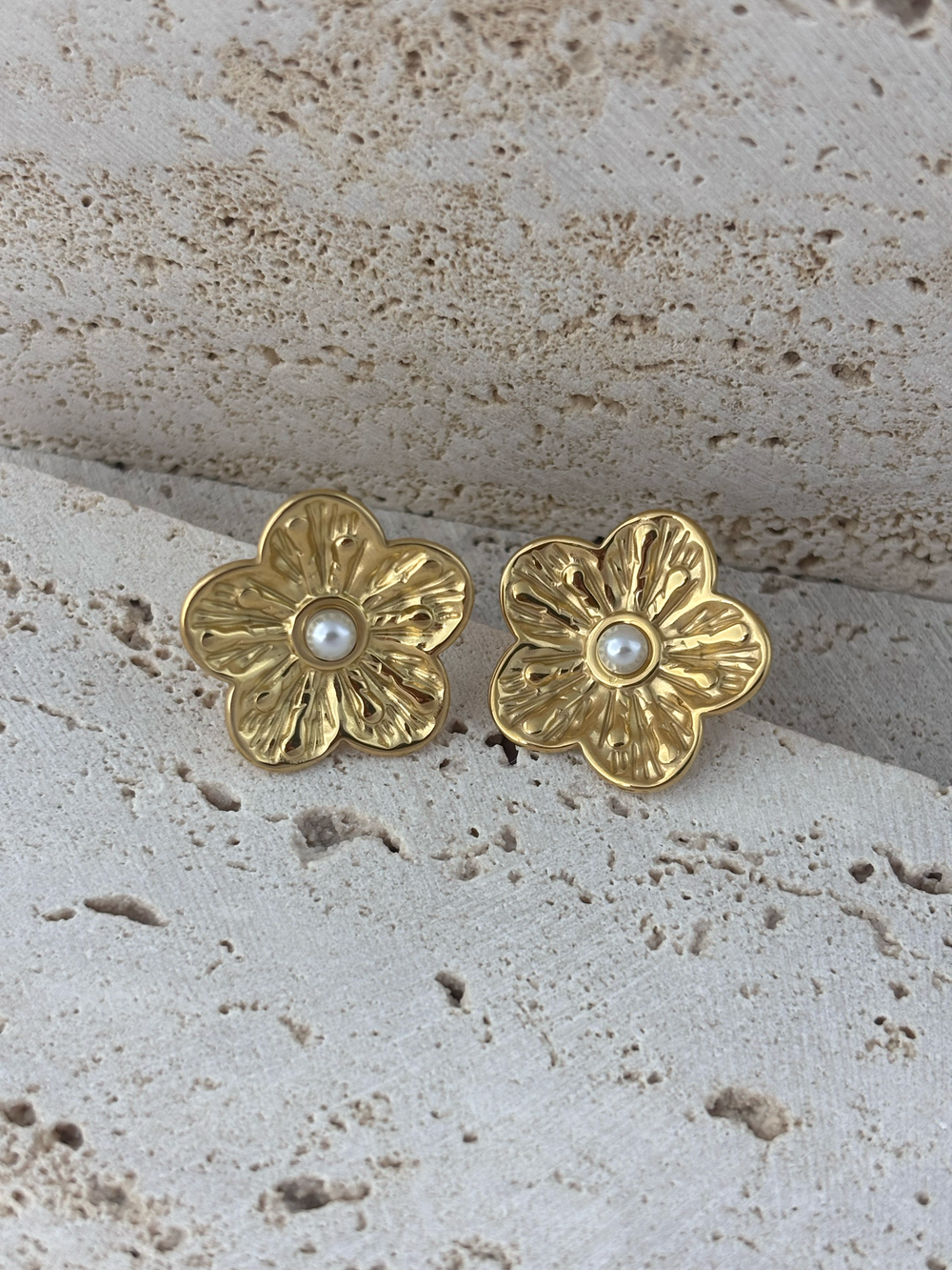 Kabartmalı çiçek formu ve merkezindeki inci detayıyla zarif bir görünüm sunar. Parlak altın tonlu paslanmaz çelik yapısı sayesinde kararma yapmaz, uzun süre parlaklığını korur. Hafif ve konforlu tasarımı günlük kullanım için ideal olup, şık kombinlere de kolaylıkla uyum sağlar.