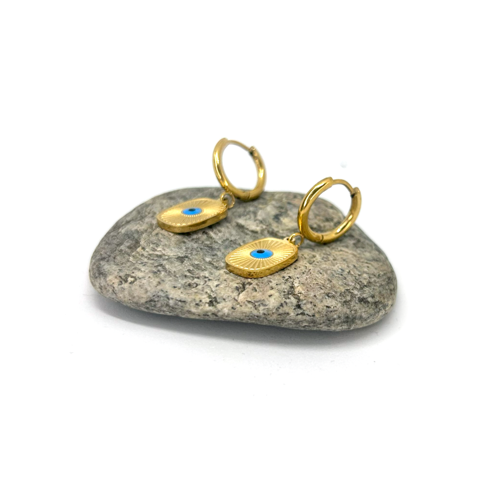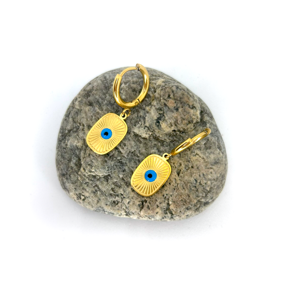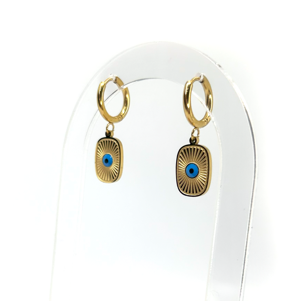 316L paslanmaz çelikten üretilen Nazar Plaka Altın Küpe; kararmaz, suya dayanıklıdır ve uzun süre ilk günkü parlaklığını korur.