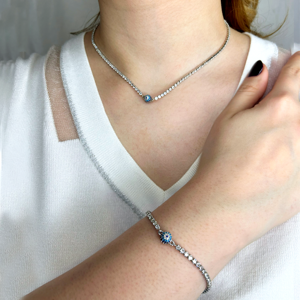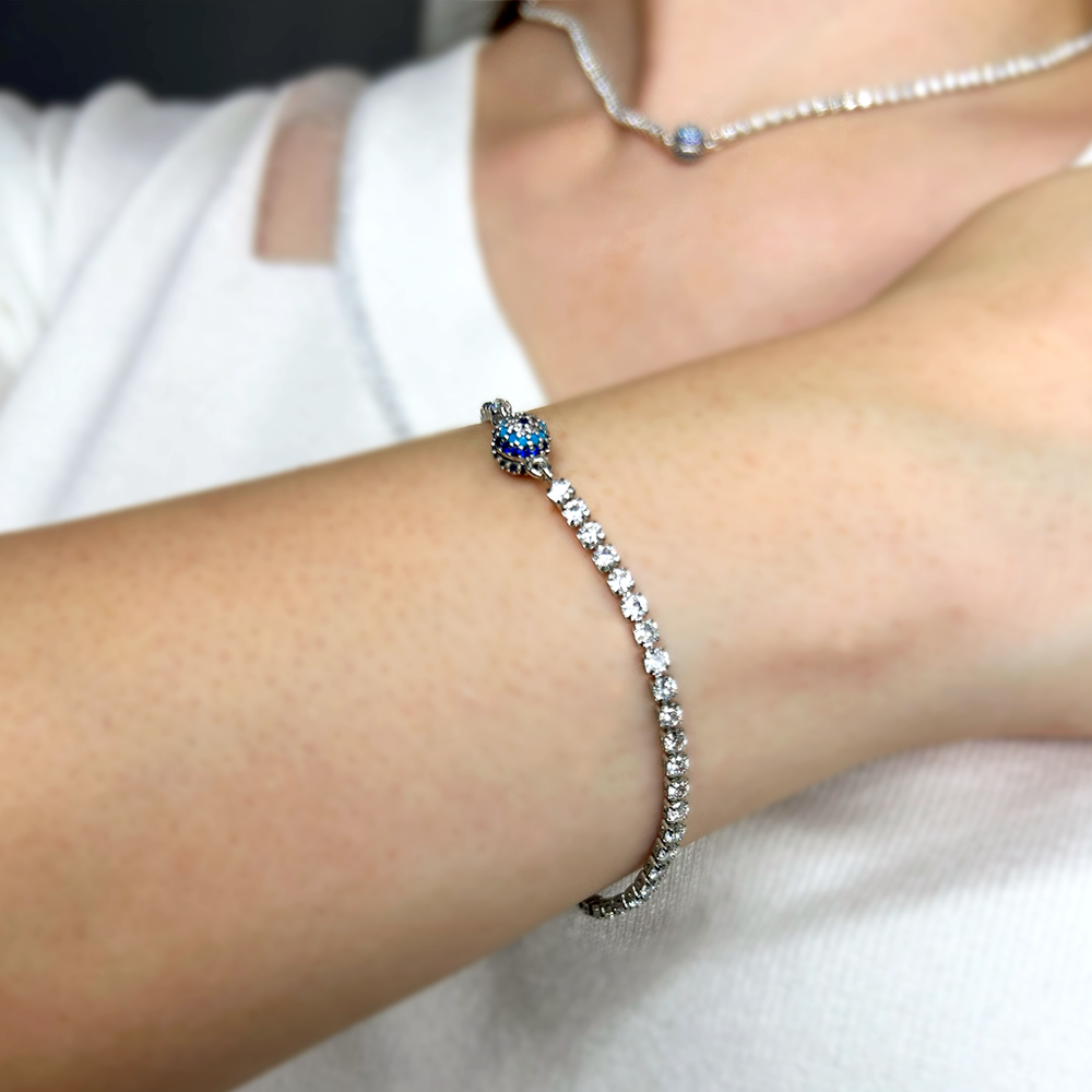 Işıltılı suyolu taş dizilimini koruyucu nazar motifiyle birleştiren bu zarif bileklik, hem şıklığı hem anlamı aynı parçada sunar. Gümüş renginin sofistike parlaklığı, günlük kombinlerde modern bir ışıltı; özel günlerde ise dikkat çekici bir tamamlayıcı oluşturur.