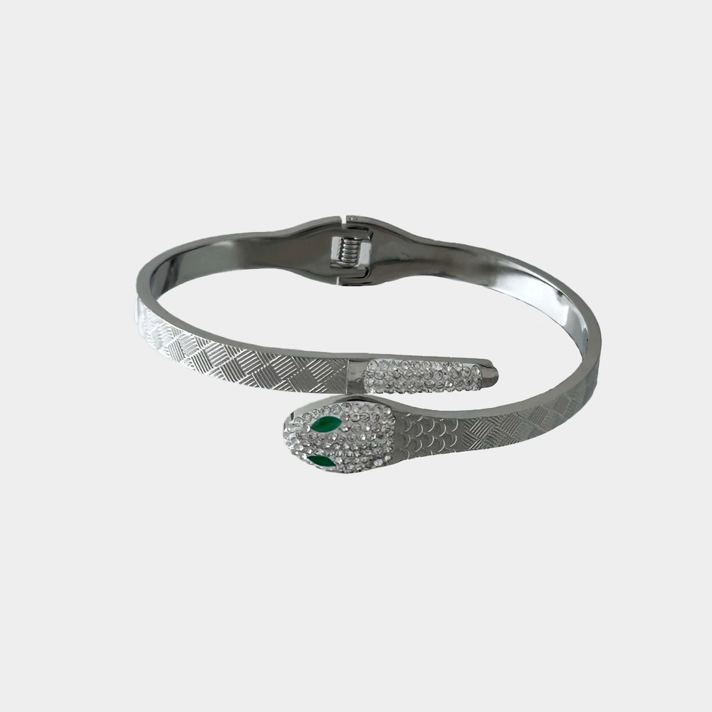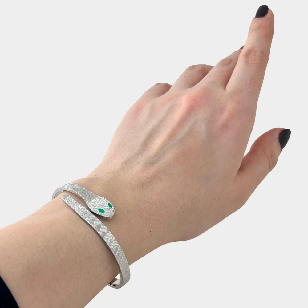 Zarif yılan formunun modern kelepçe tasarımıyla buluştuğu bu bileklik, bilekte hem güçlü hem de stil sahibi bir duruş oluşturur. Gümüş renginin sade ışıltısı yılan figürünün mistik havasıyla birleşerek günlük stilinize karakter ve şıklık katar.