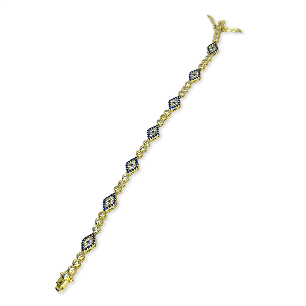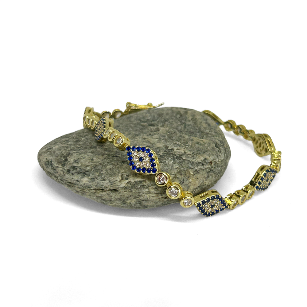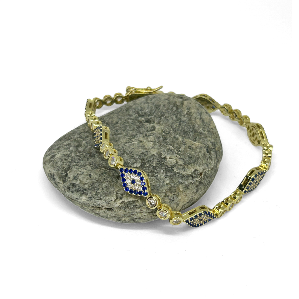 Işıltılı taşlardan oluşan suyolu diziliminin koruyucu nazar motifiyle buluştuğu bu bileklik, şıklığı ve anlamı birlikte sunar. Altın rengi tonuyla öne çıkan model, hem günlük stil için hem de özel gün kombinleri için ideal bir tamamlayıcıdır.