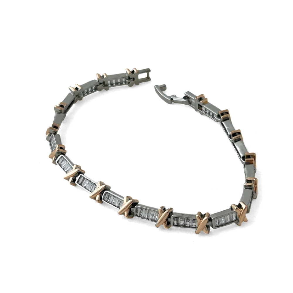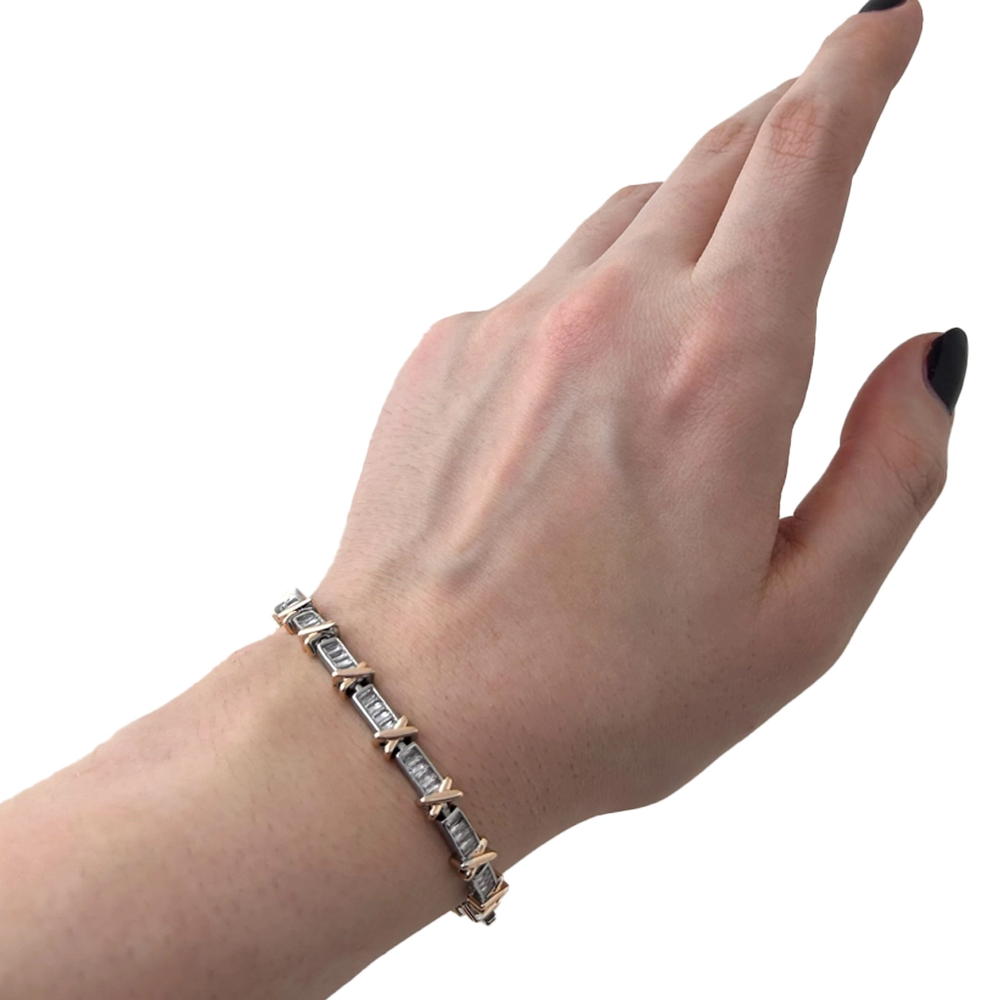 İnce “X” motifli detaylarla süslenmiş suyolu taş diziliminin romantik rose altın tonuyla birleştirildiği bu bileklik, ışıl ışıl ve feminen bir şıklık sunar. Günlük stilinize zarif bir vurgu katarken özel anlarda da dikkat çekici bir tamamlayıcıdır.