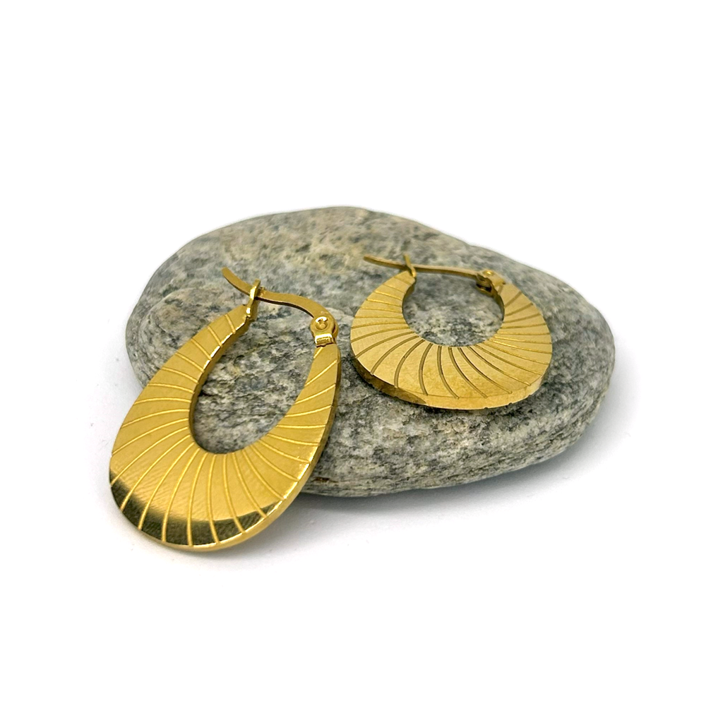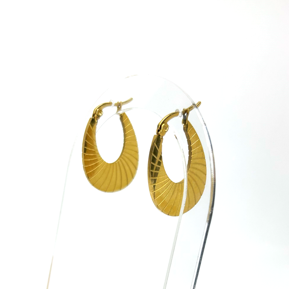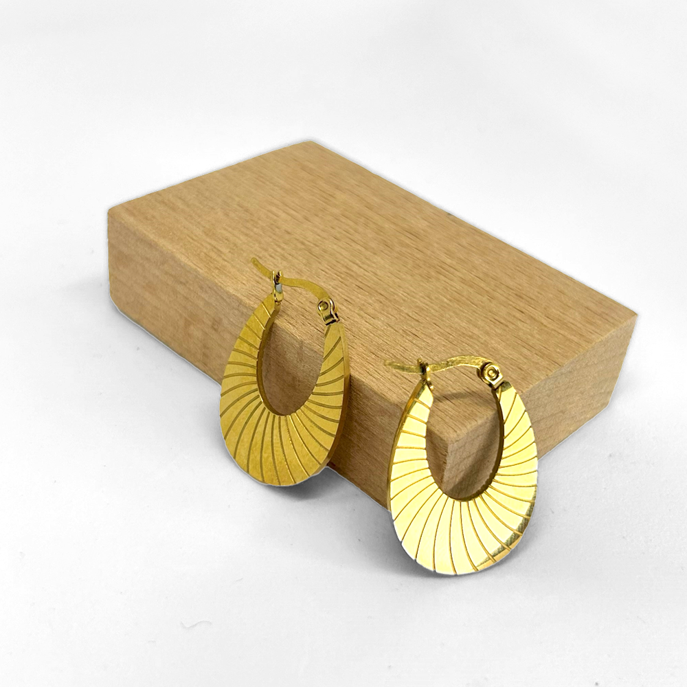 316L paslanmaz çelikten üretilen Oval Halka Altın Küpe; kararmaz, suya dayanıklıdır ve uzun süre parlaklığını korur.