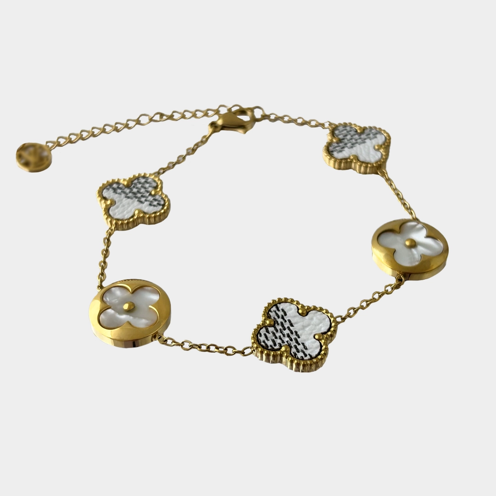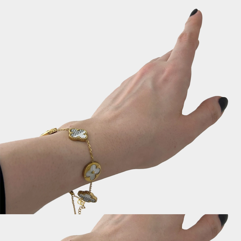 316L paslanmaz çelikten üretilen, altın kaplamalı yüzeye sahip Beyaz Yonca Altın Bileklik; kararmaz, suya dayanıklıdır ve günlük kullanıma uygundur.