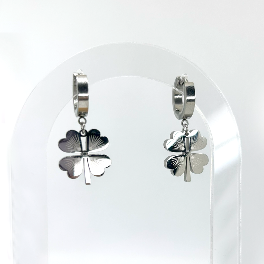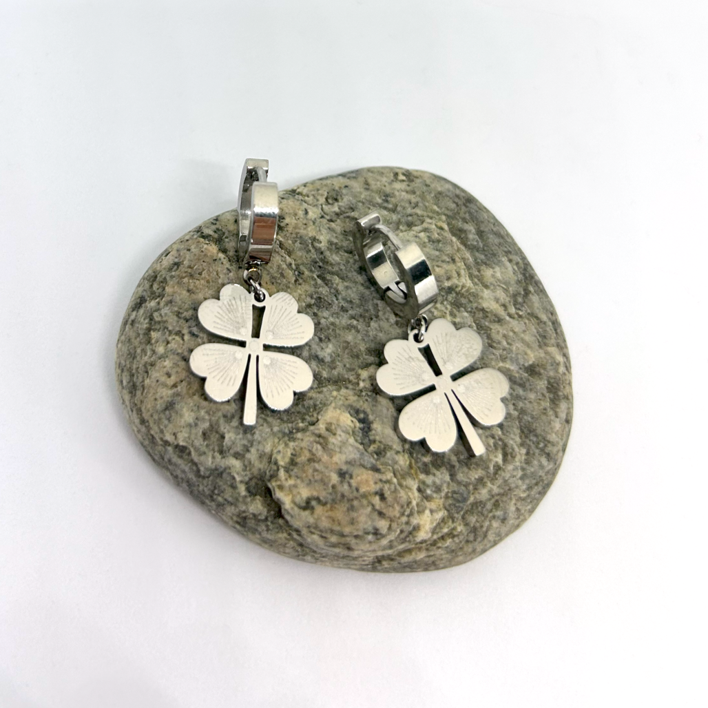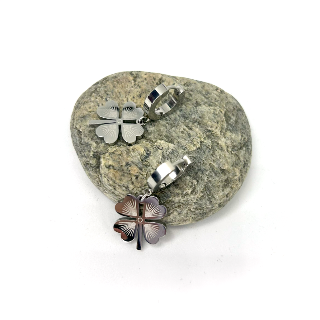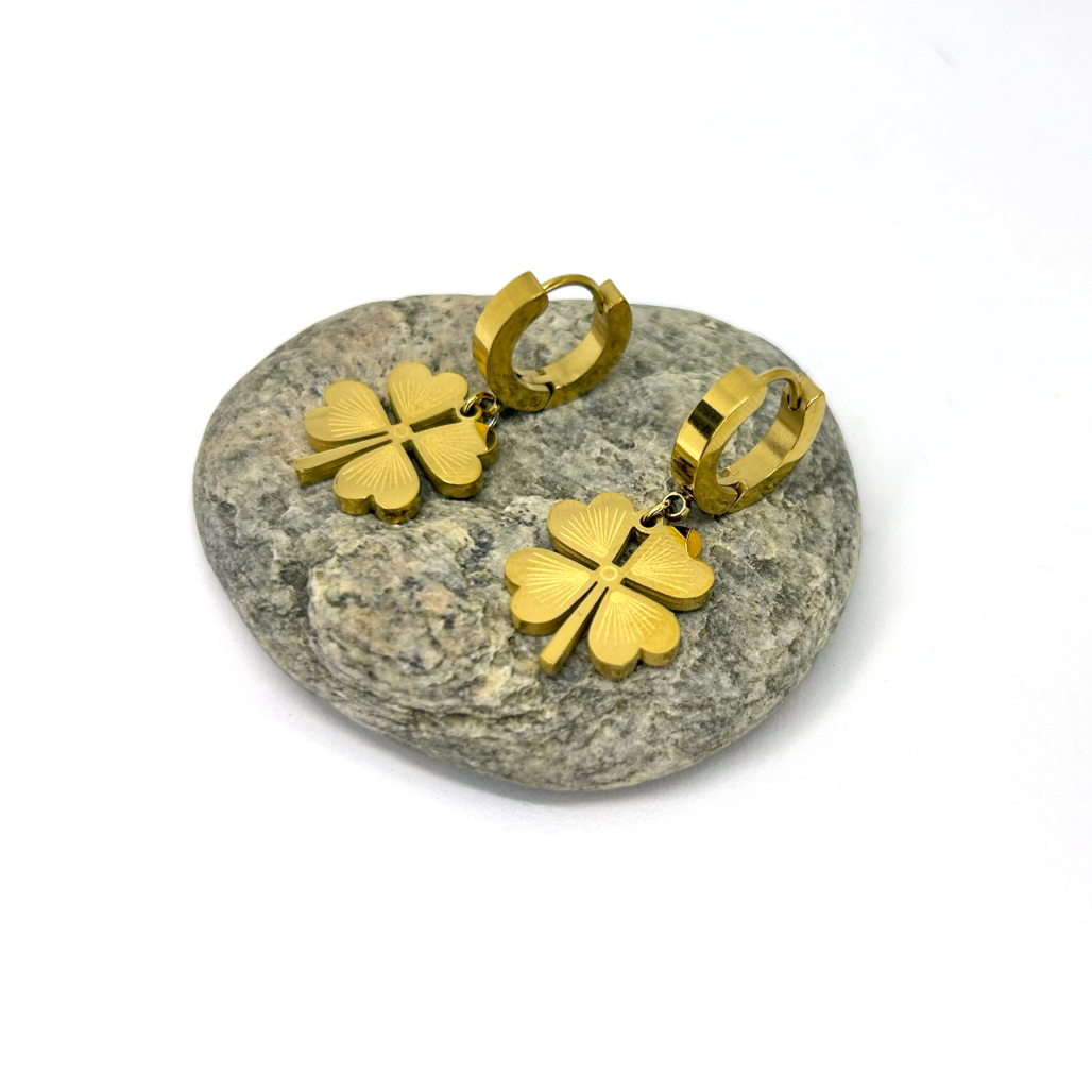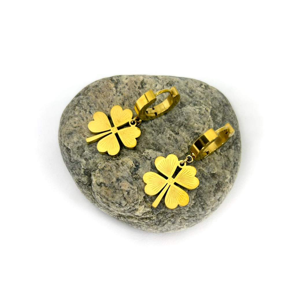 316L paslanmaz çelikten üretilen, altın Kaplamalı yüzeye sahip Yonca Şans Küpe; kararmaz, suya dayanıklıdır ve günlük kullanıma uygundur.