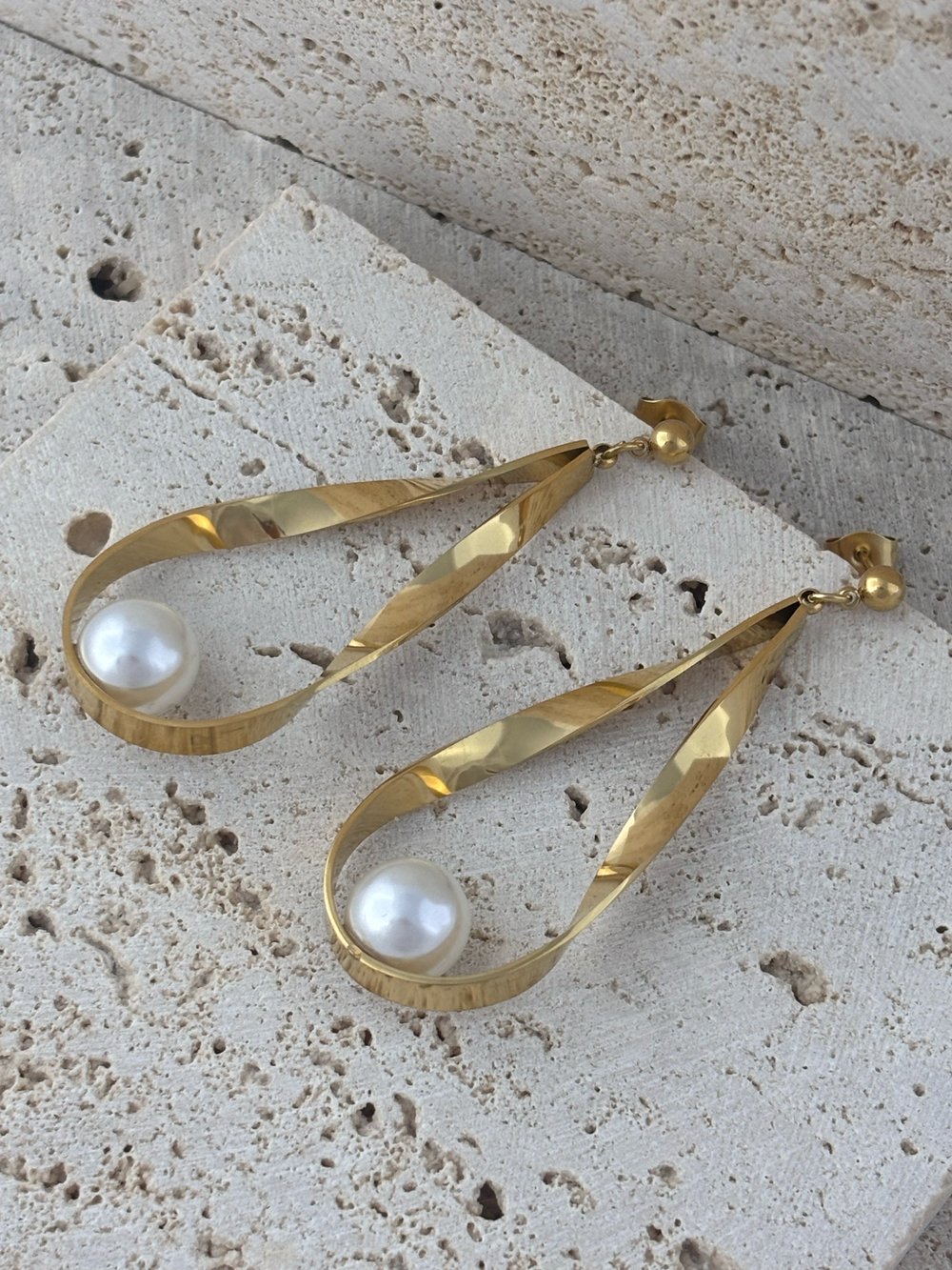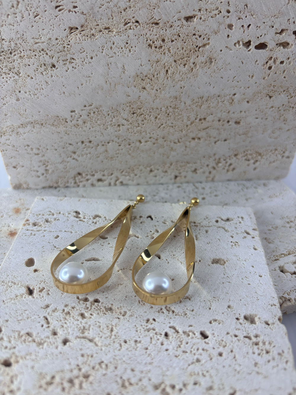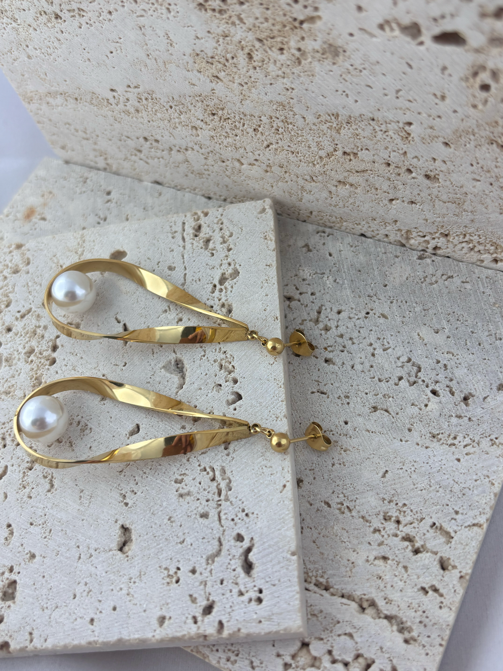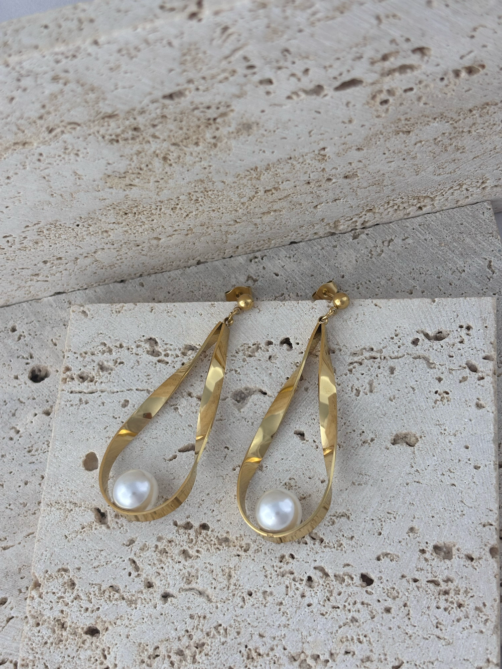 Parlak altın tonunda burgulu damla formu ve uç kısmındaki zarif inci detayıyla modern bir görünüm sunar. Paslanmaz çelik yapısı sayesinde kararma yapmaz, uzun süre ilk günkü parlaklığını korur. Hafif ve konforlu yapısıyla günlük kullanımda da, özel günlerde de kolayca tercih edilebilir.